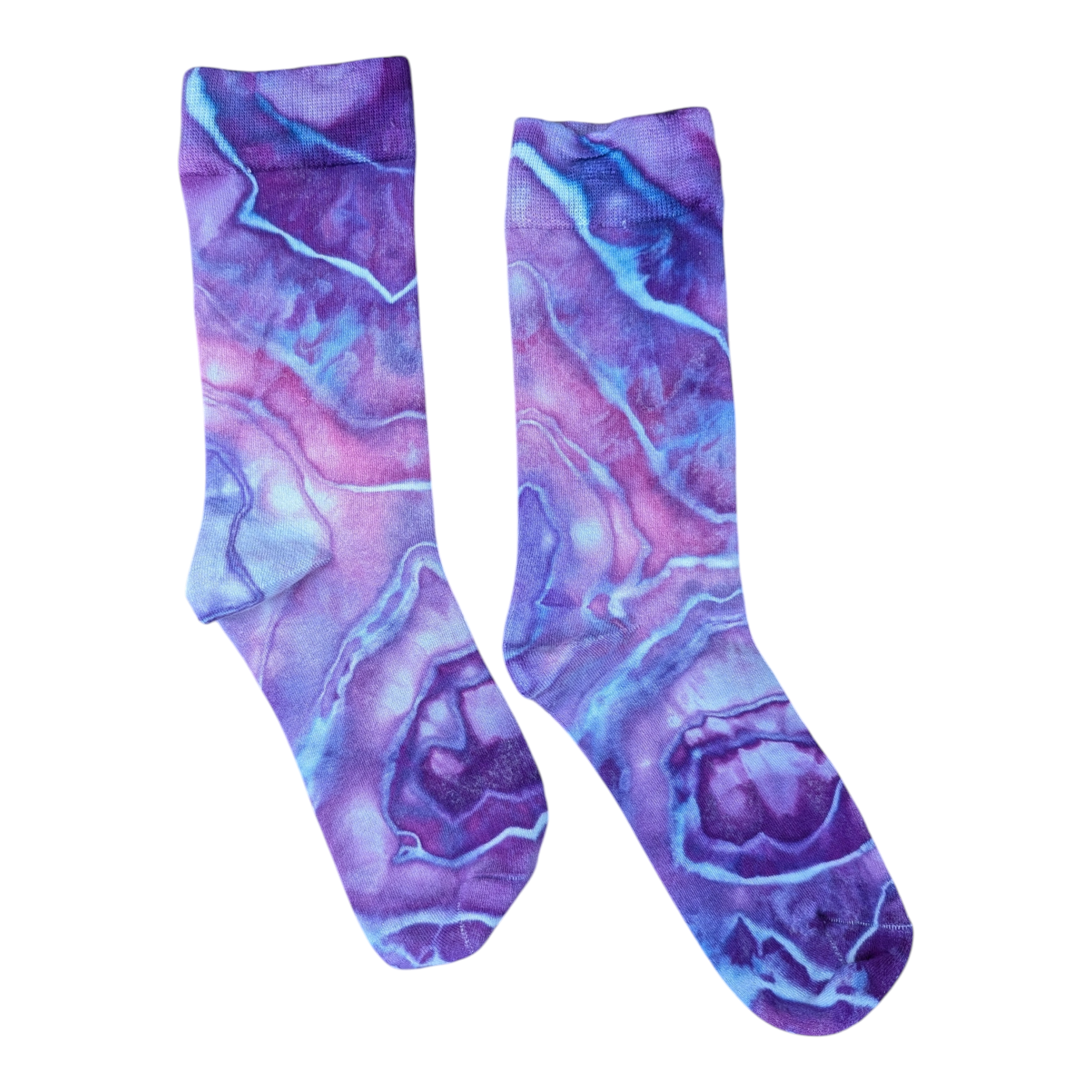 Step up your sock game with these vibrant geode style tie-dye crew socks in shades of purple, pink, and pops of blue. Made from soft and comfortable viscose material, these socks are perfect for adding a pop of color to any outfit.