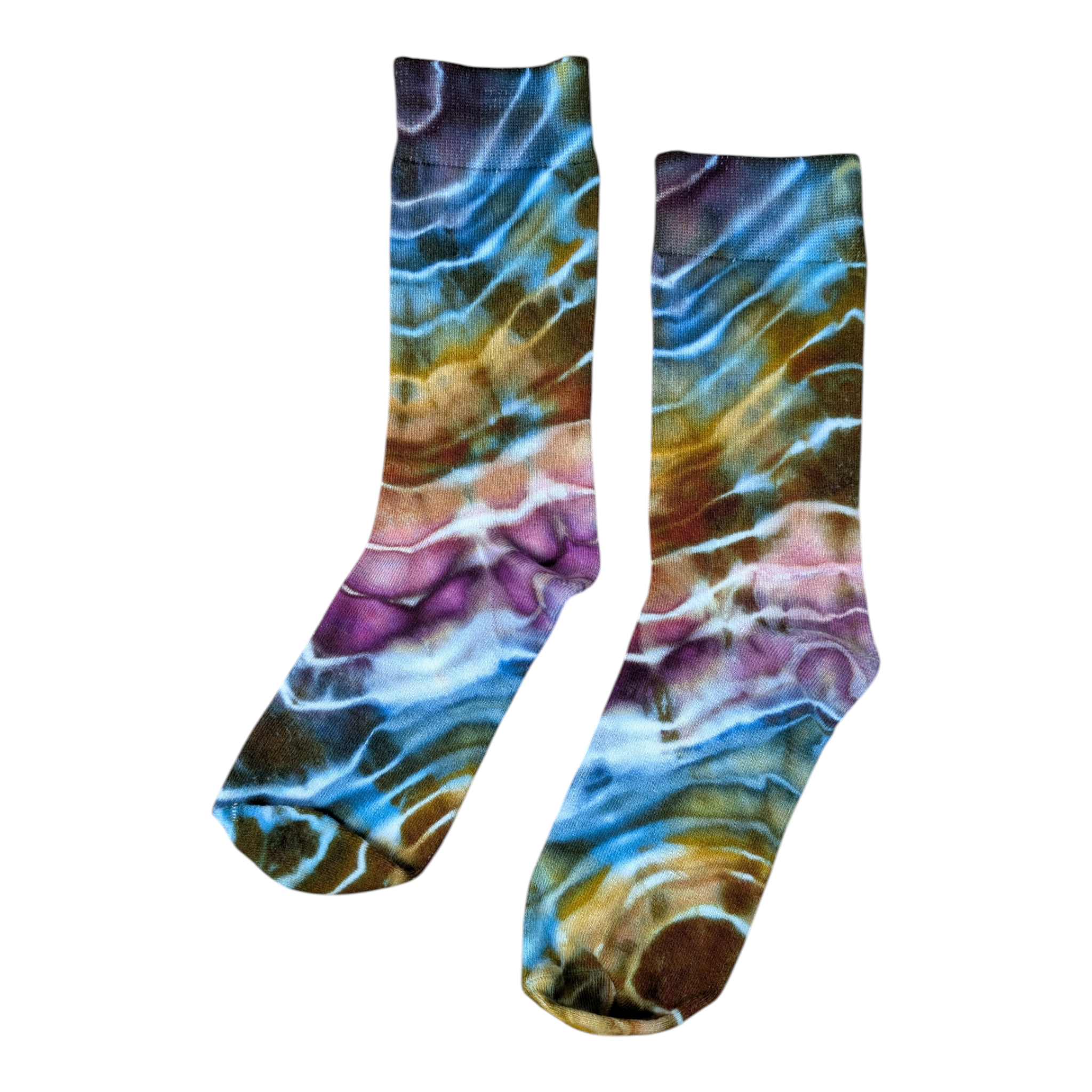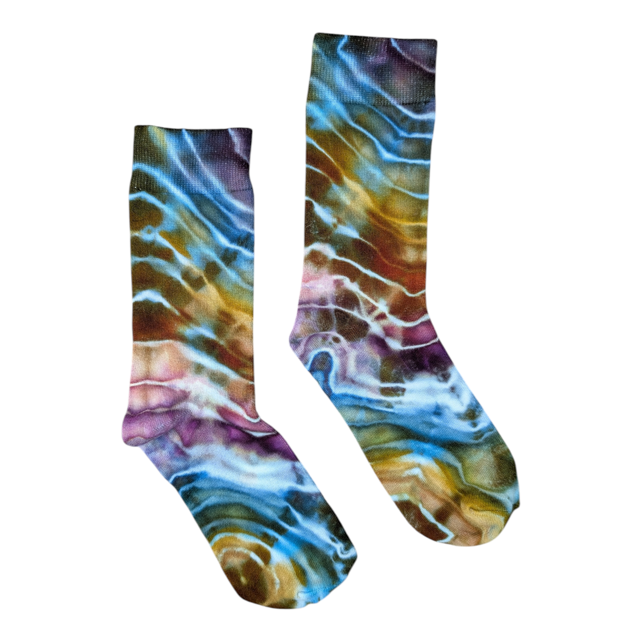 Step up your sock game with these vibrant tie-dye crew socks featuring a geode style design in Autumn rainbow colors. Made from viscose material, these socks are very soft and stretchy for all-day comfort.