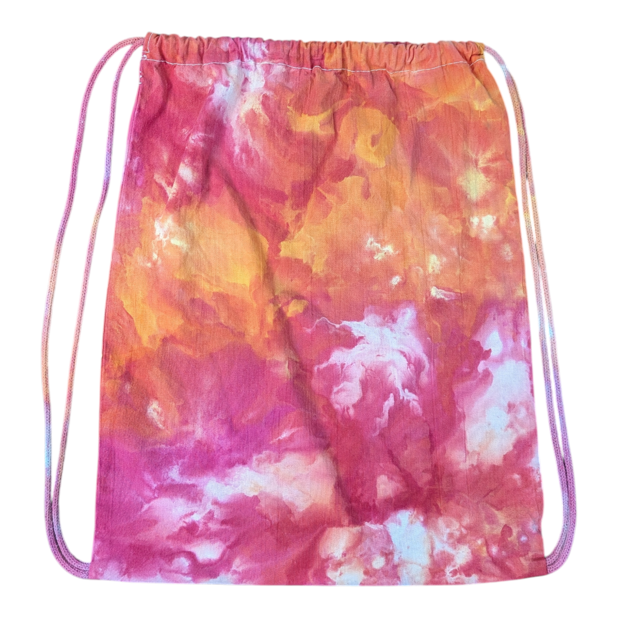 This cotton unisex tie-dye drawstring bag is ice dyed in a scrunch style design in shades of pink, orange, yellow and coral. Great accessory to carry around your necessities.