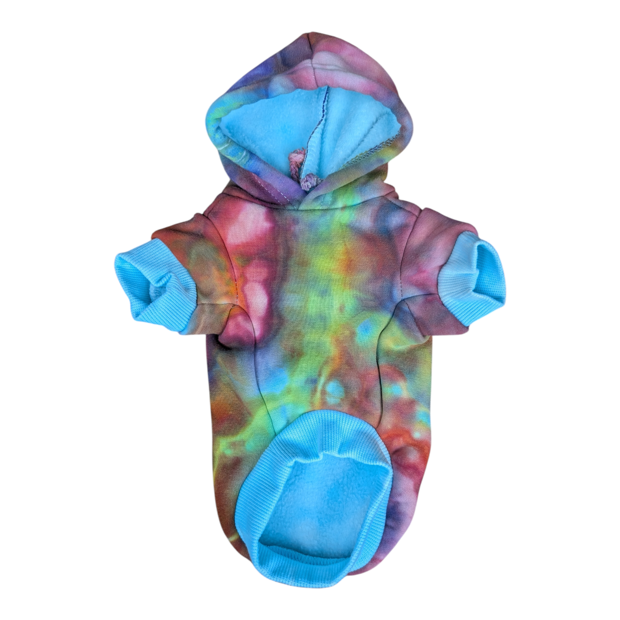 Let your furry friend stand out in this rainbow tie dye small dog hoodie featuring a geode style design. Made with 65% cotton and 35% polyester, this hoodie is warm and soft, perfect for chilly walks. It even has a hole for the leash to come through, making it both stylish and practical.