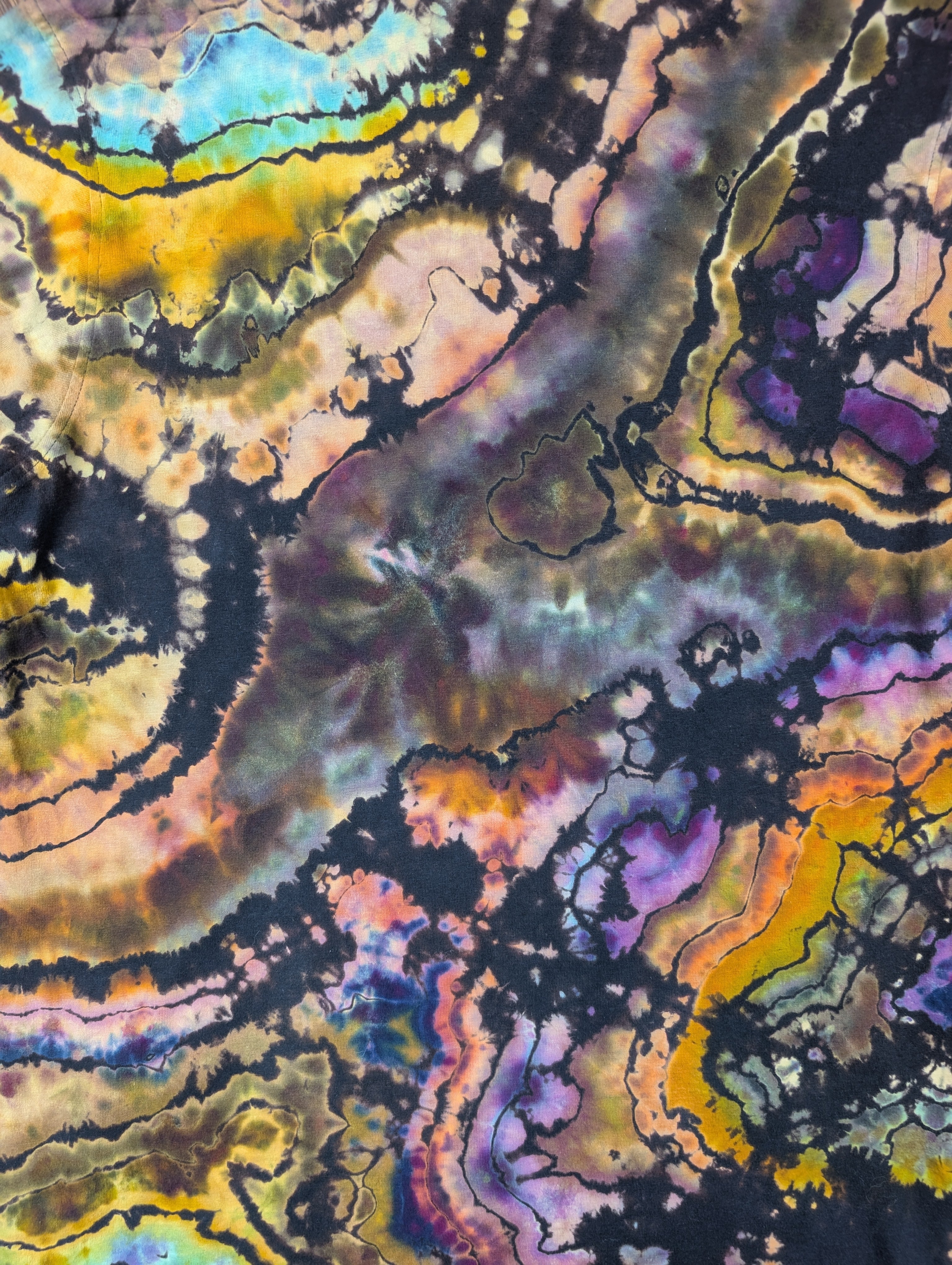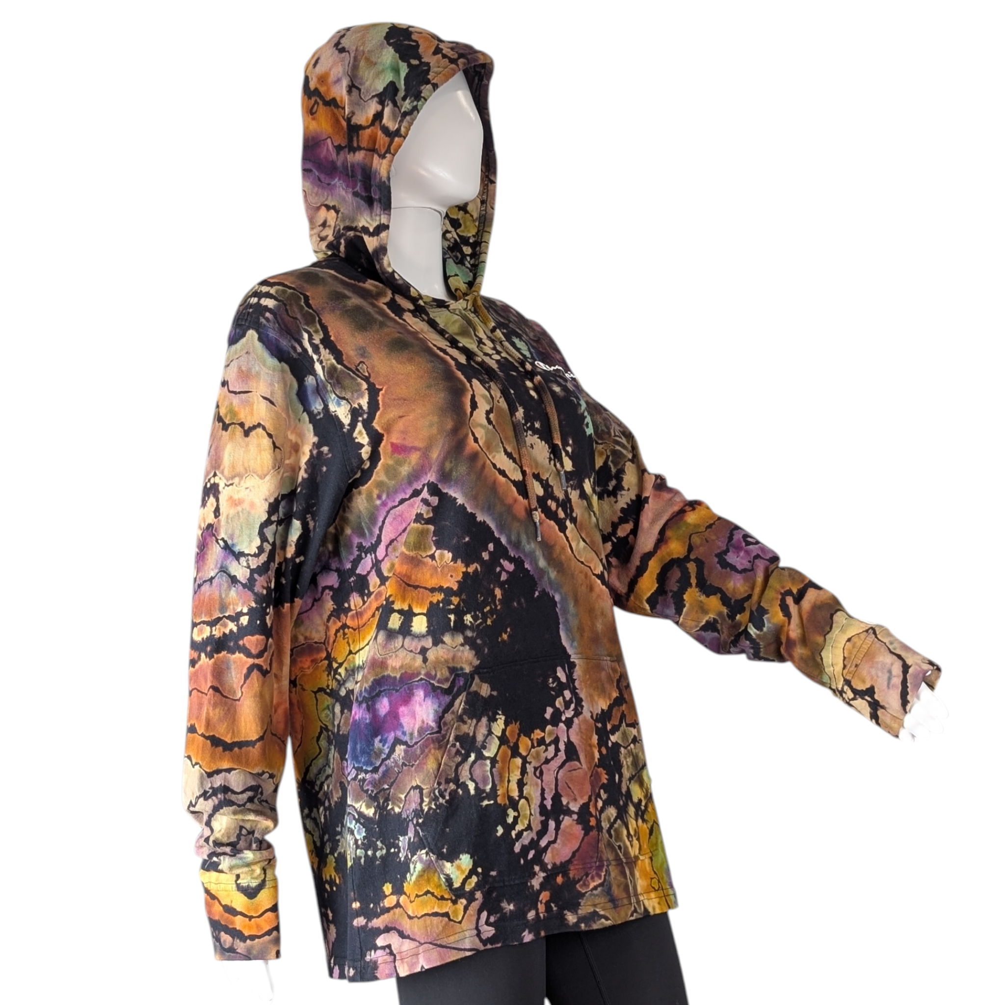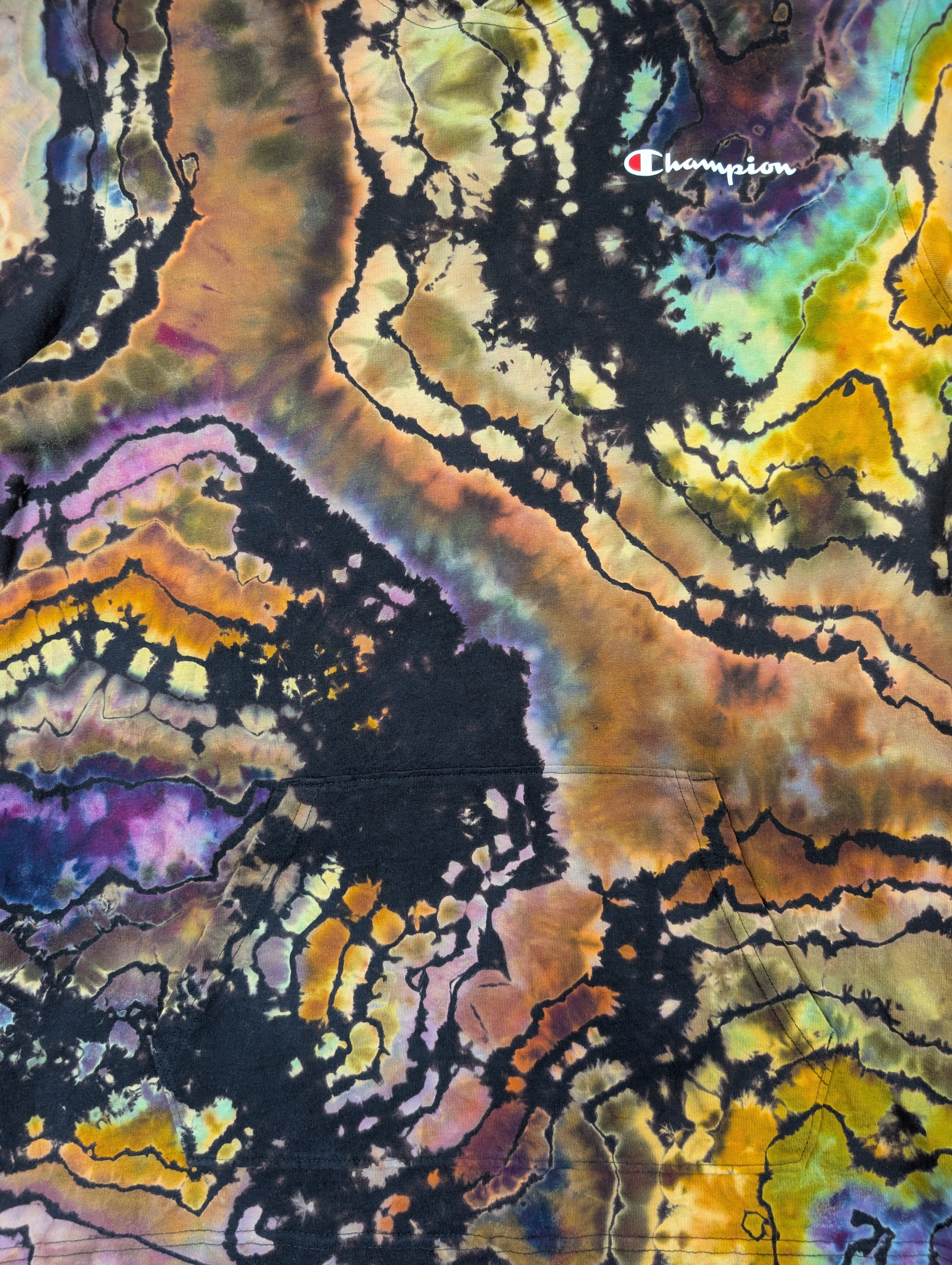 Stay cozy and stylish in this men's medium reverse tie dye hooded long sleeve tee featuring a geode style design in black and Autumn rainbow colors. Made of 100% cotton, this Champion brand tee has front pockets, a hood, and a puffy Champion logo on the front. Perfect for everyday wear, this tee is soft and comfortable.