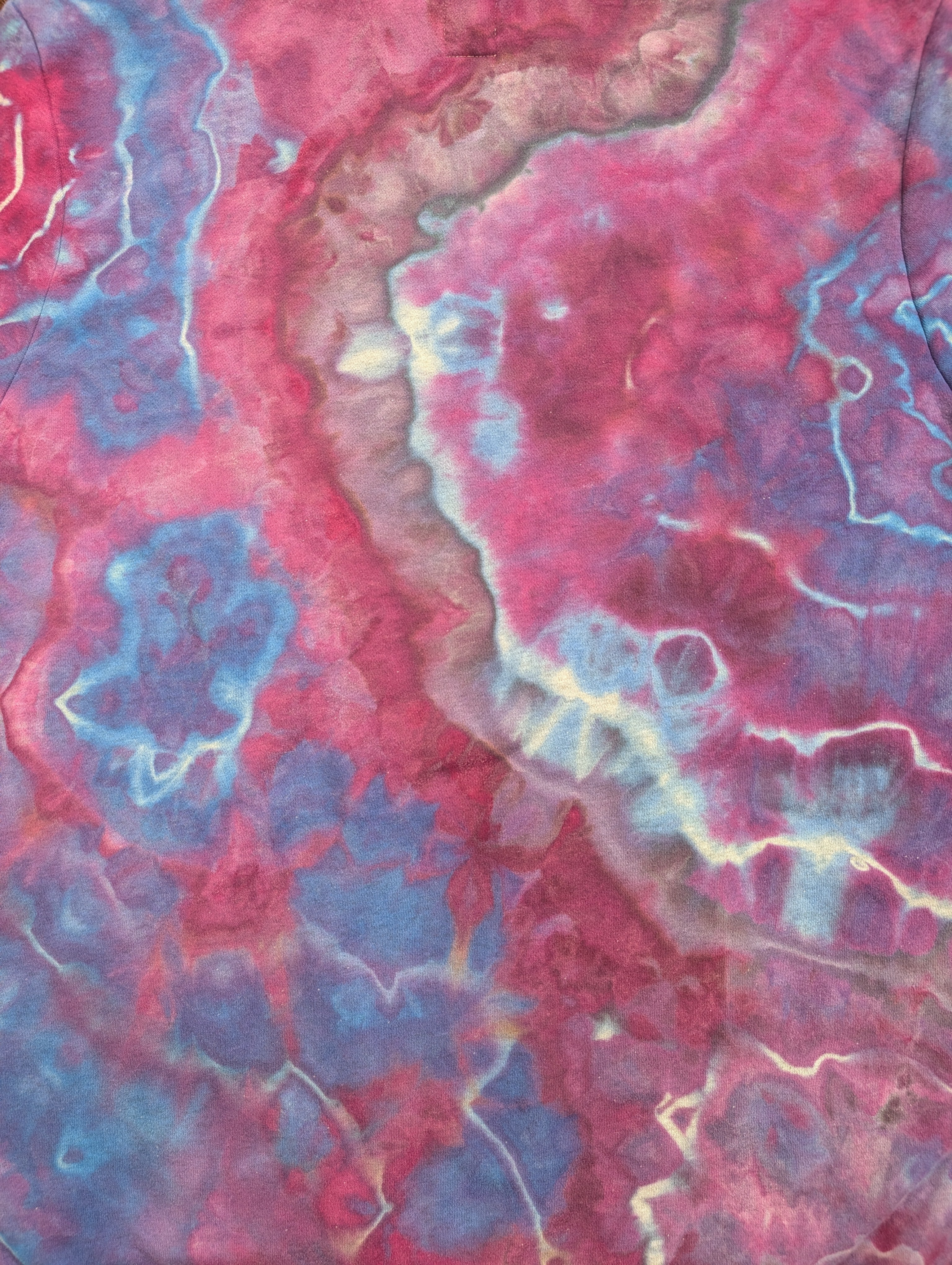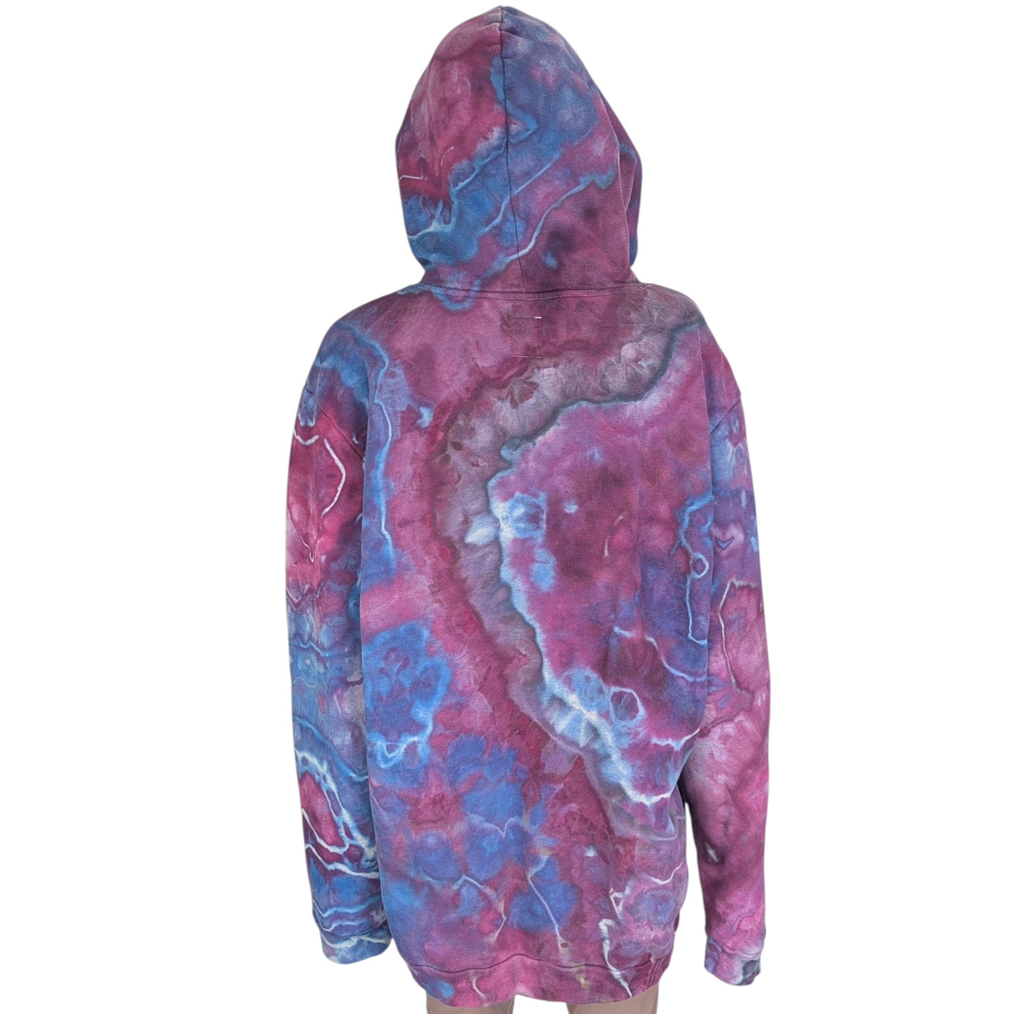 Stay cozy and stylish in this Old Navy brand pullover hoodie featuring front pockets, a geode style design, and hand dyed in shades of blue, purple, pink magenta, and gray. Made with 77% cotton and 23% polyester, this previously Heather gray hoodie is super comfortable for everyday wear.