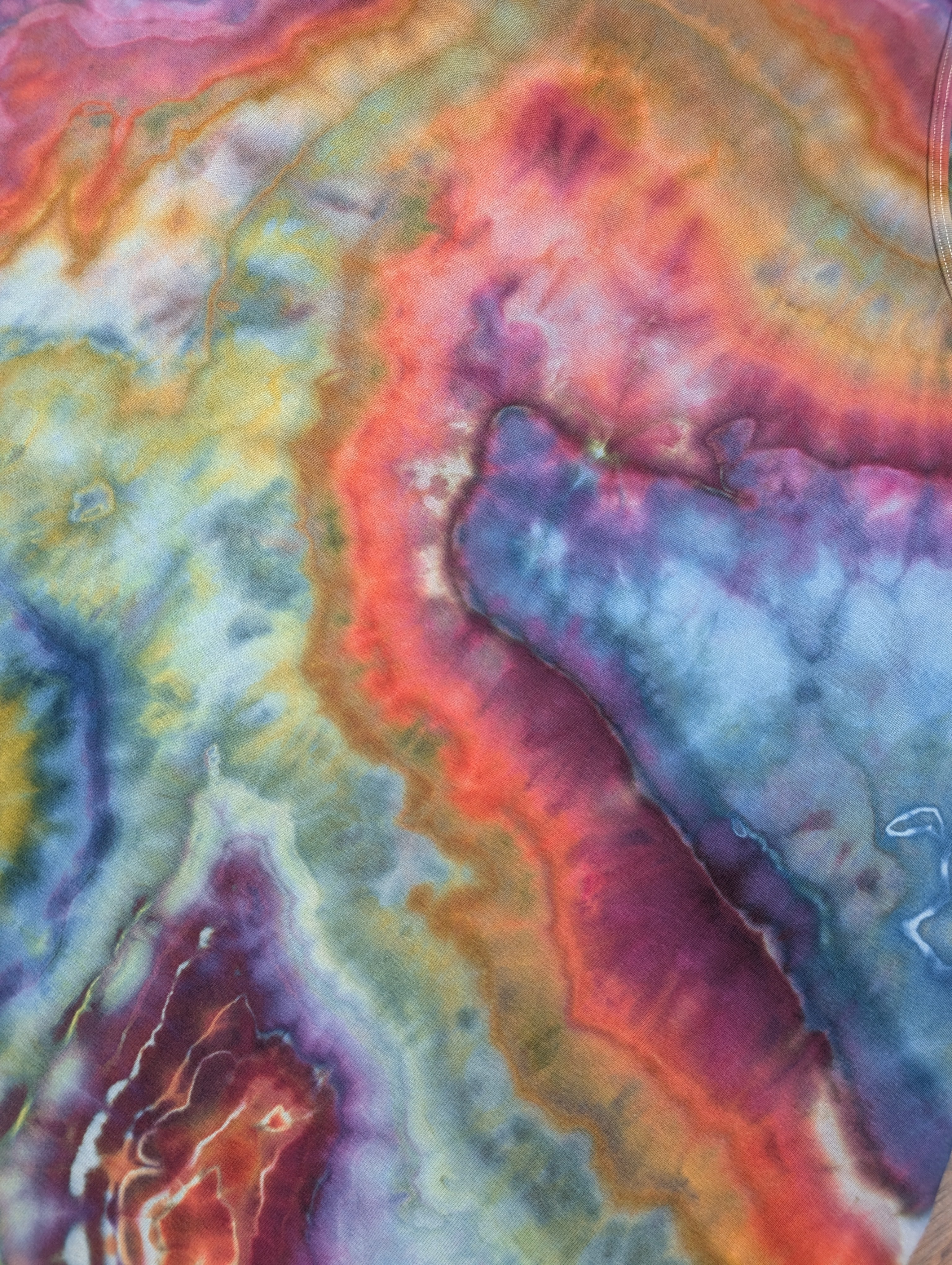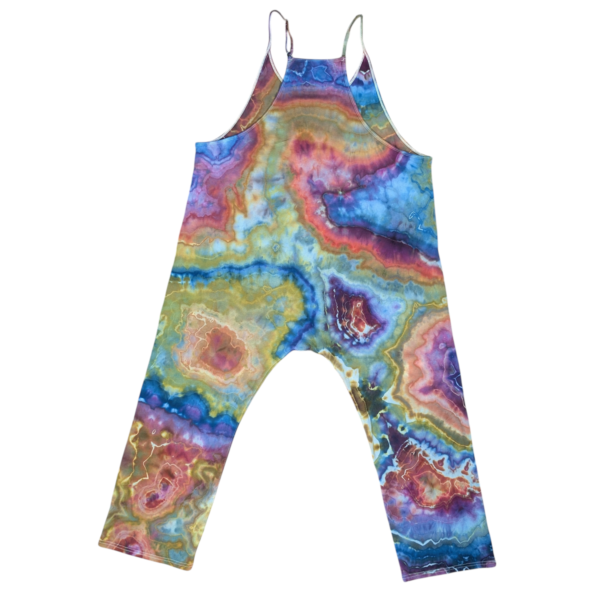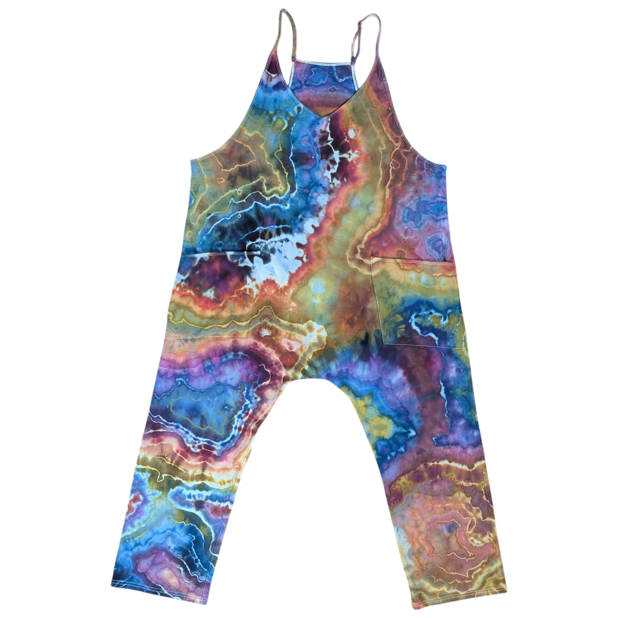 Stay stylish and comfortable in this women's geode tie-dye jumpsuit. Made from 92% cotton, this Tarse jumpsuit features adjustable straps and pockets for convenience. The geode style design in an Autumn rainbow color way makes it perfect for everyday wear, whether you're lounging at home or heading out.