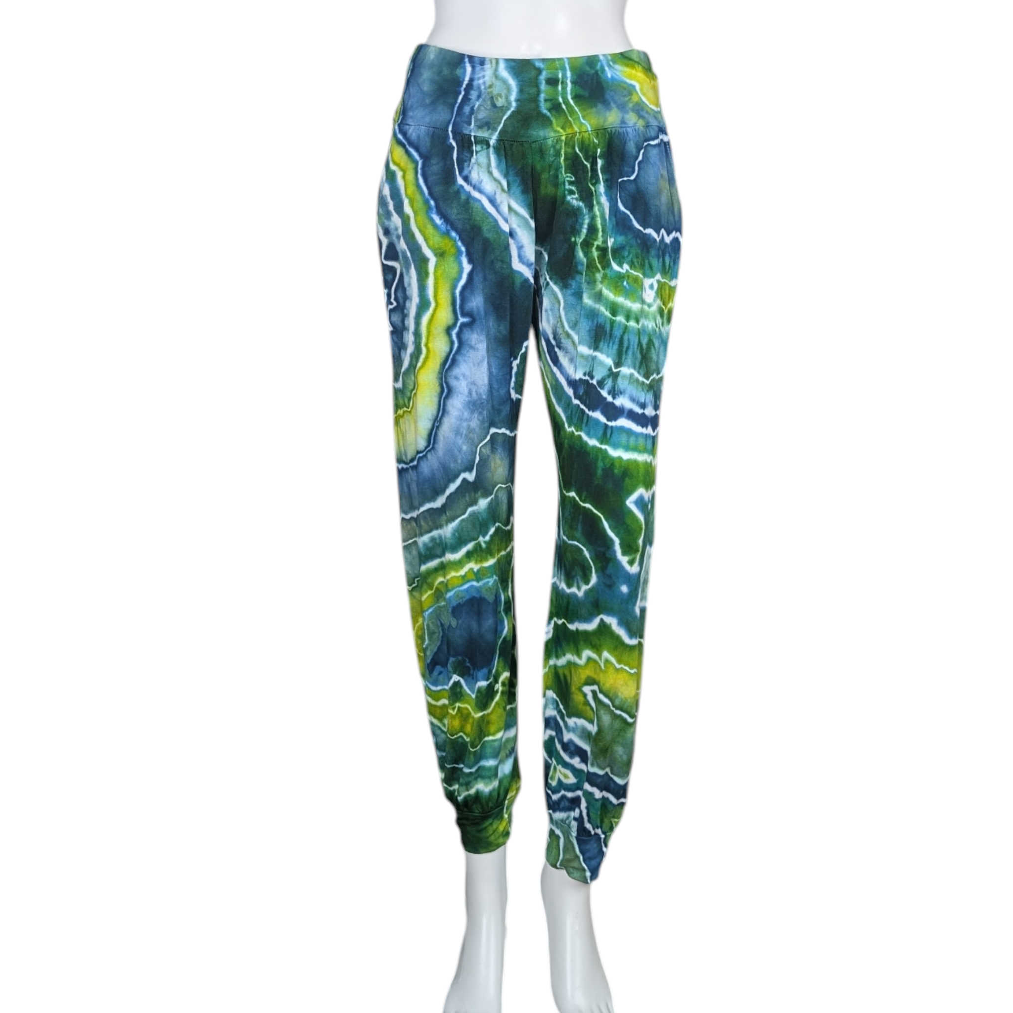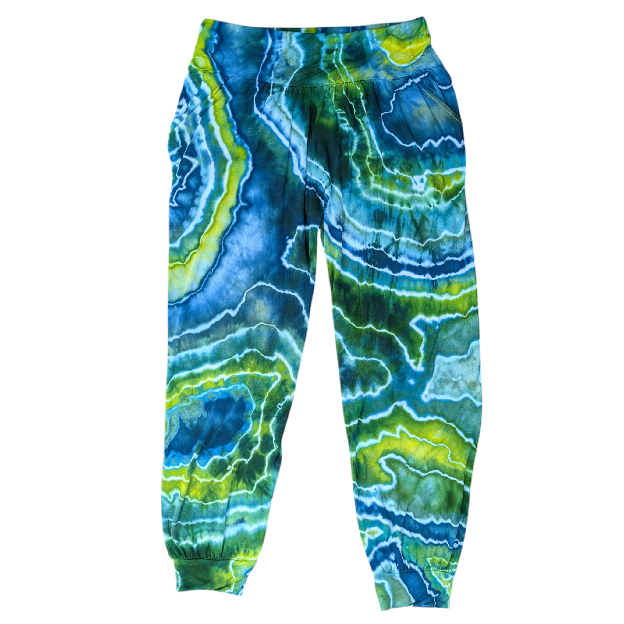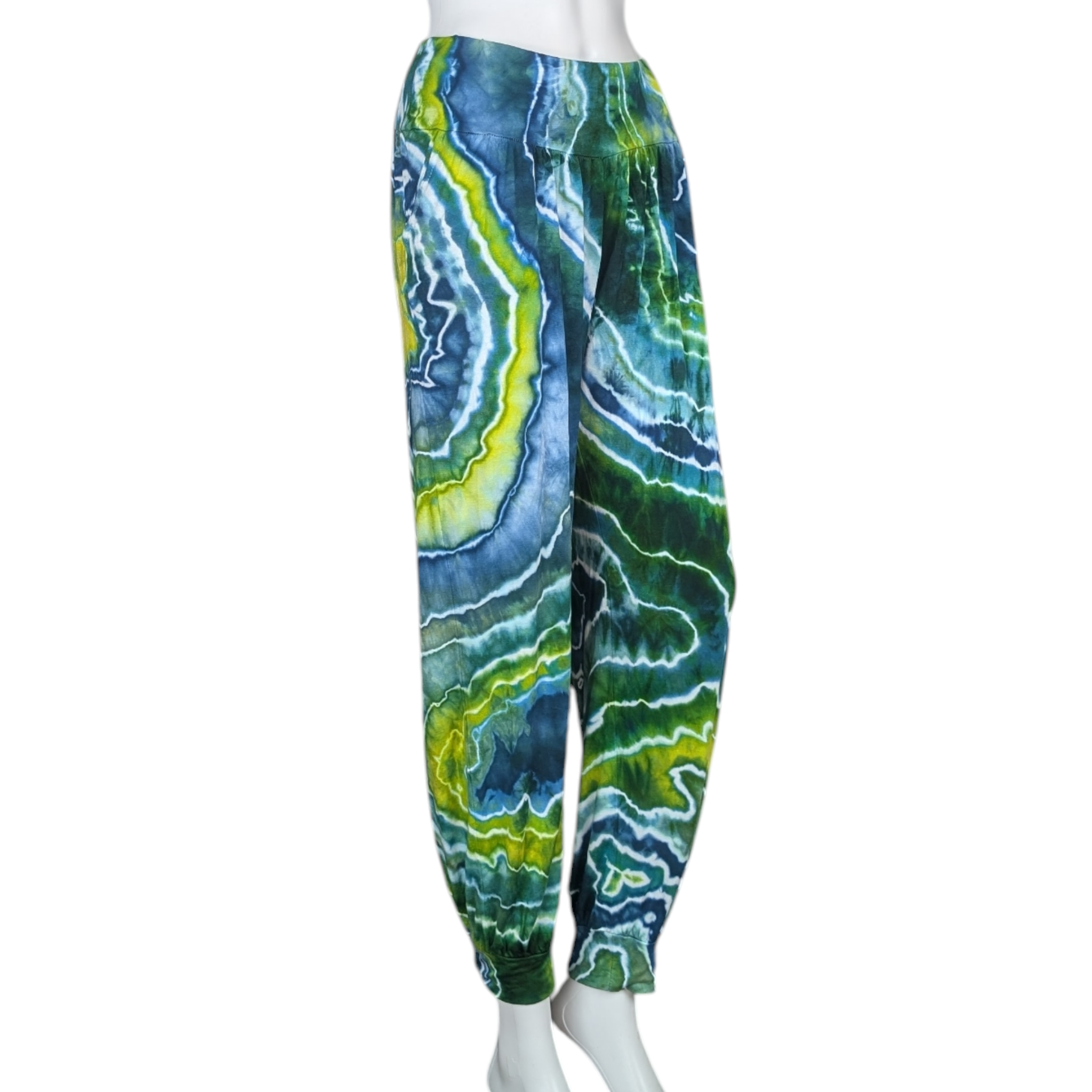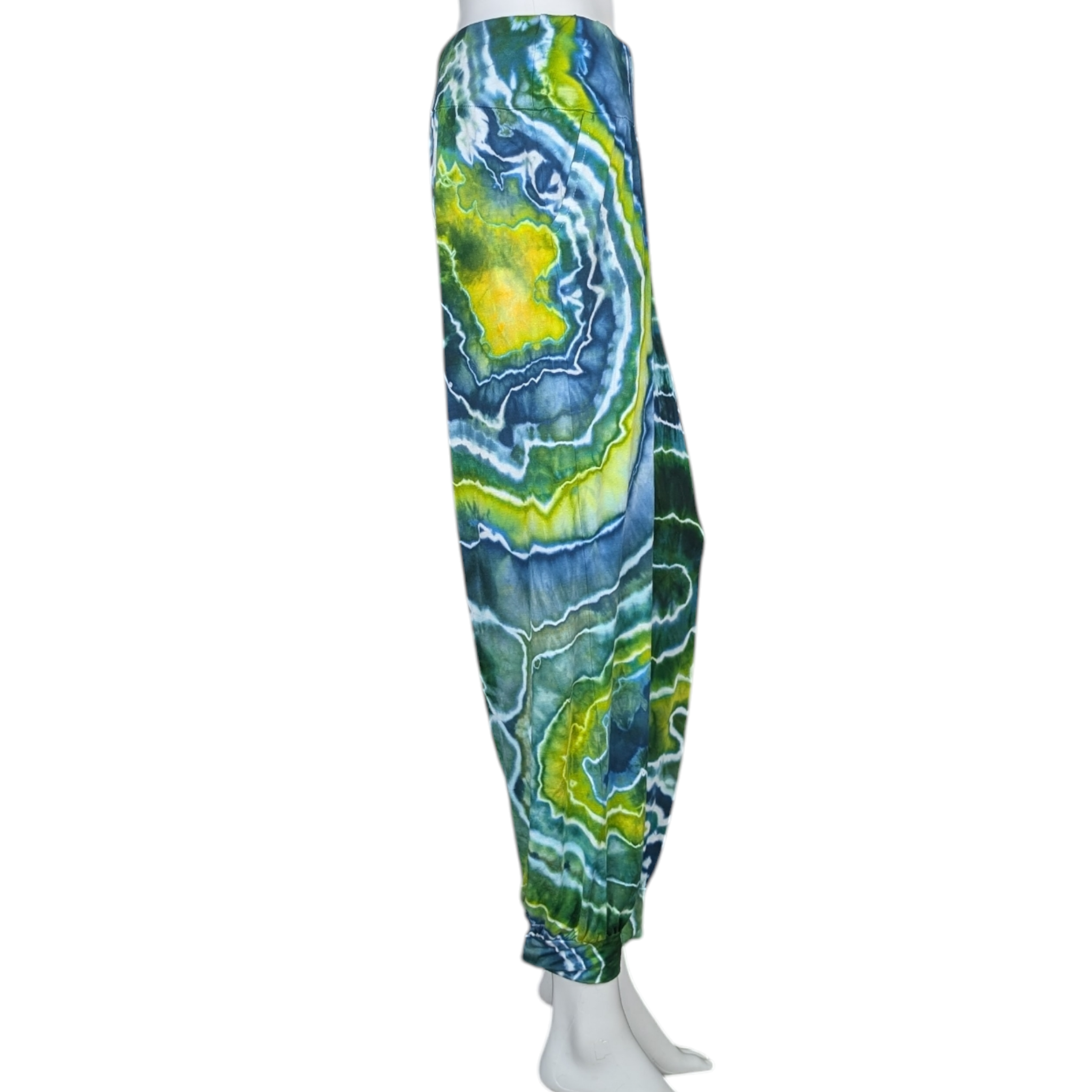 Get ready to lounge in style with these stunning geode tie dye harem pants. Made from 95% cotton material, these pants are soft, thin, and comfortable, perfect for yoga or everyday wear. The beautiful shades of blue, green, turquoise, and lime green will make you stand out in the crowd. Complete with pockets and an elastic waistband, these pants are a must-have for any fashion-forward person.