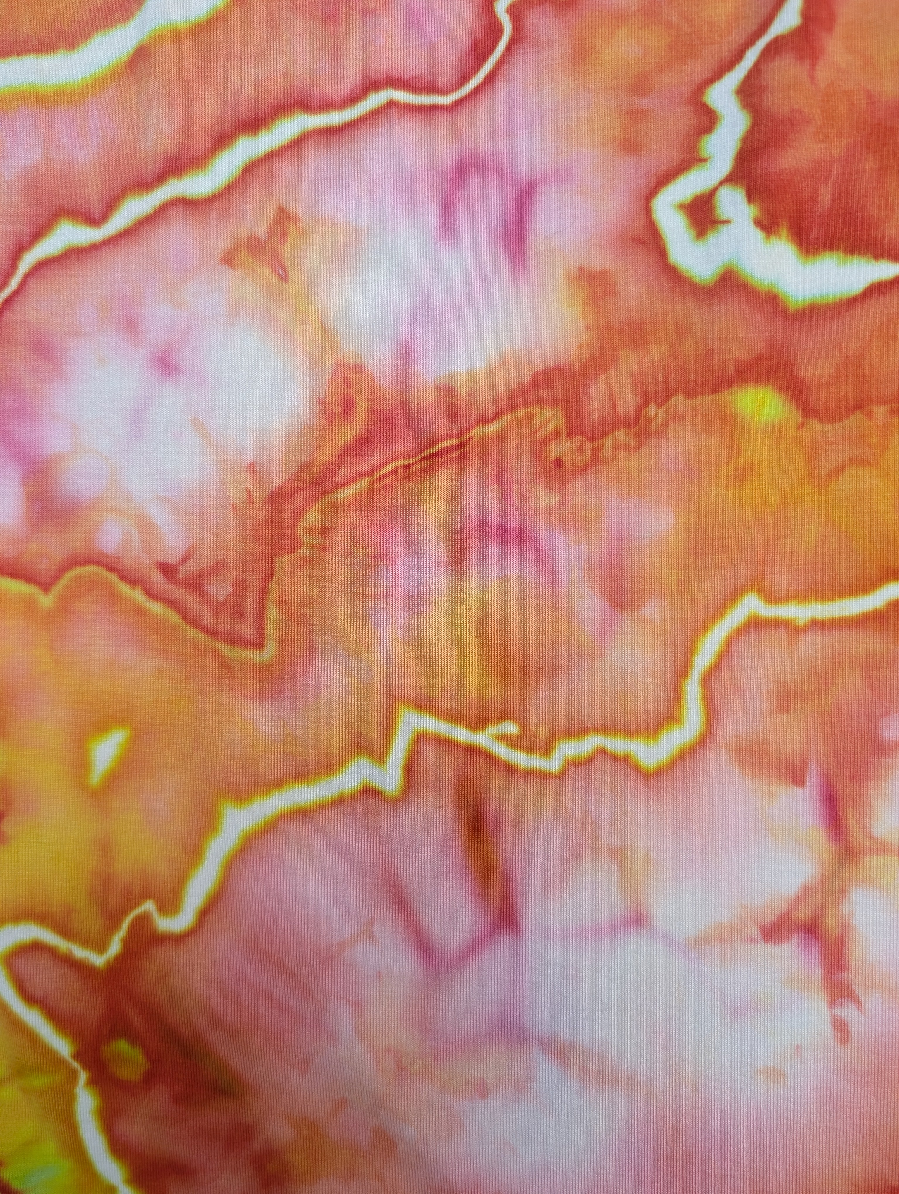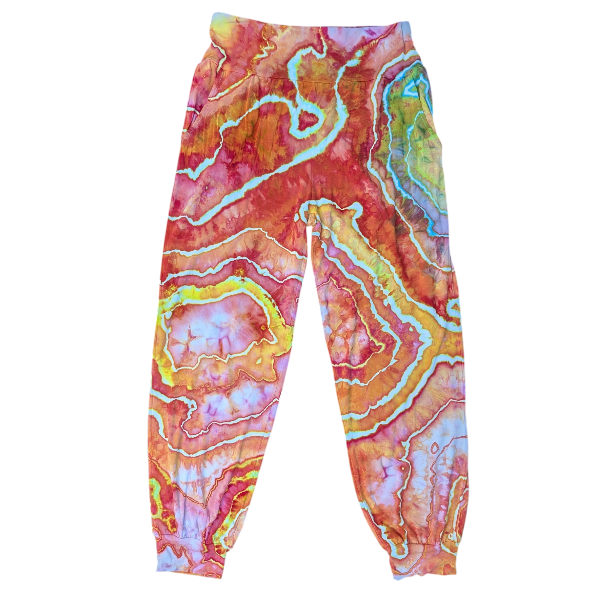 Get ready to stand out in these vibrant geode style tie dye harem pants! Made with a soft and comfortable 95% cotton material, these pants feature bright colors of orange, yellow, pink, green, and teal with pops of yellow. Complete with pockets and an elastic waistband, these pants are perfect for lounging, yoga, or everyday wear.
