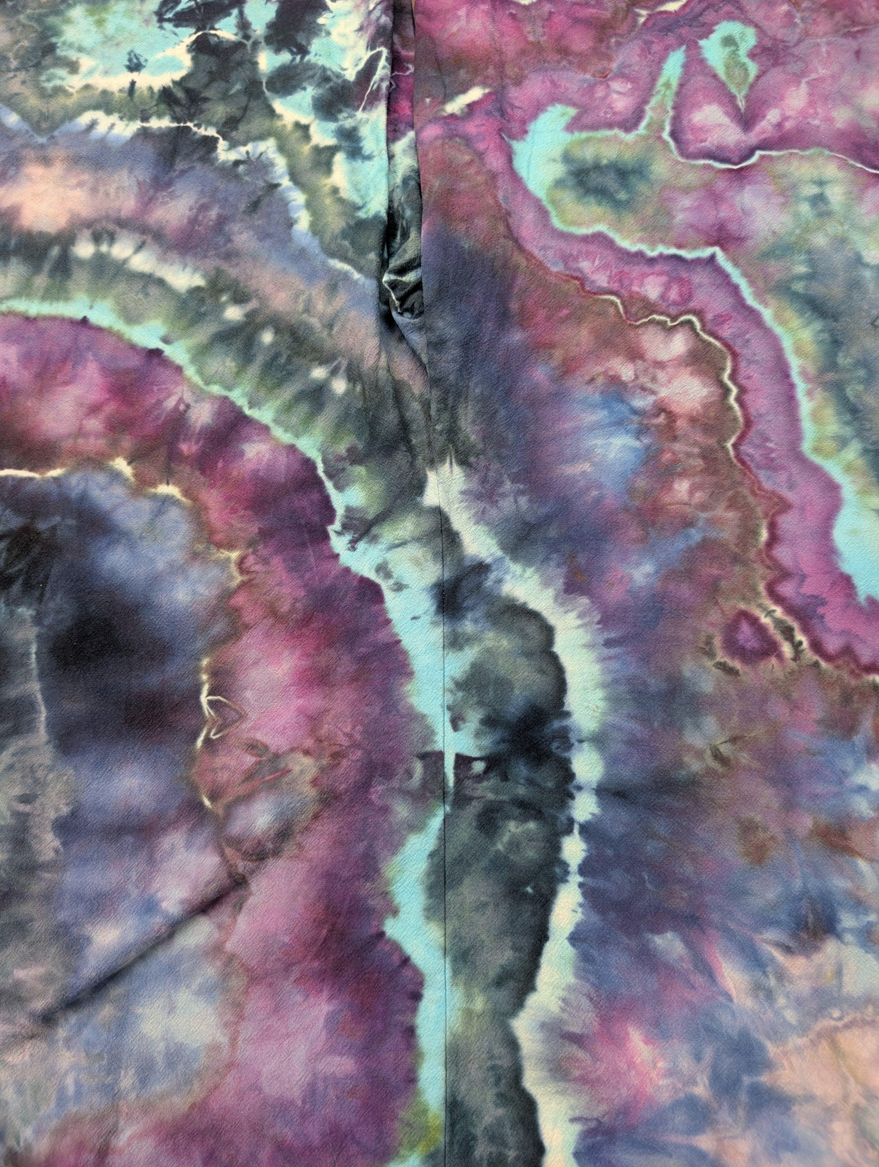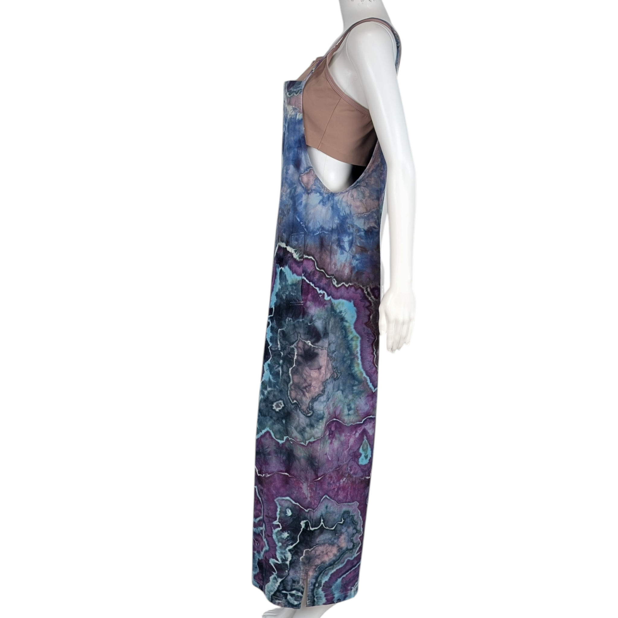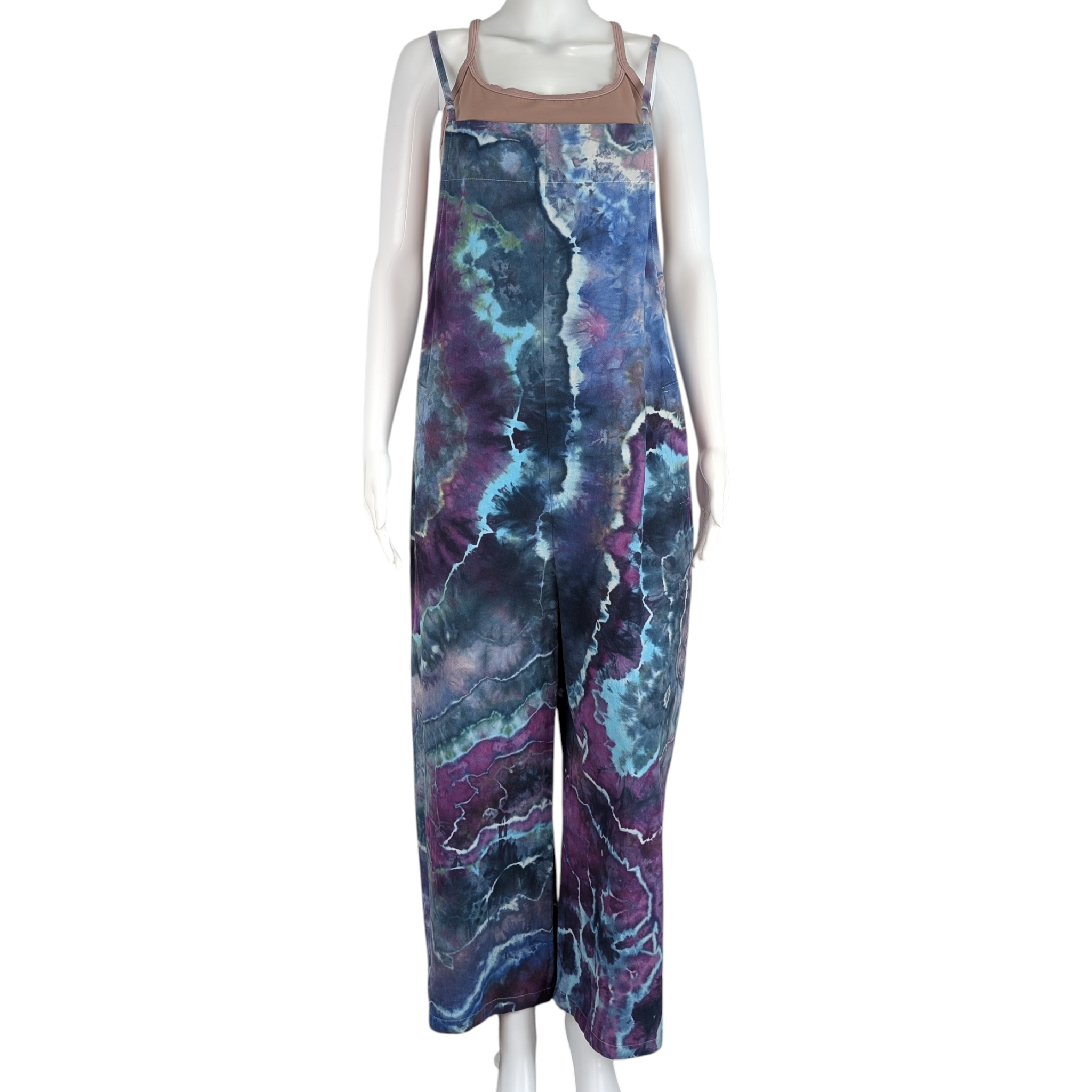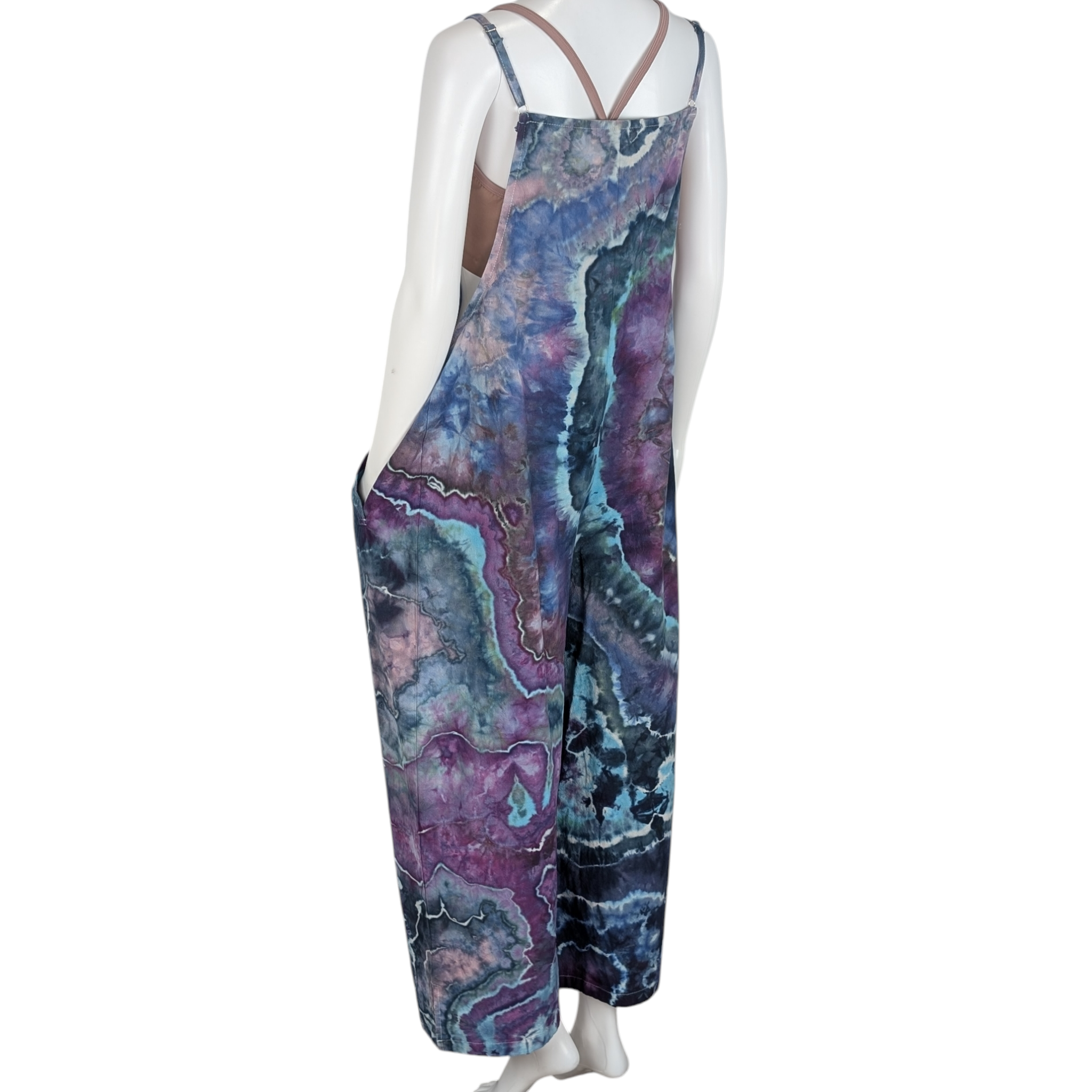 Step into style with this stunning geode tie-dye jumpsuit in shades of purple, blue, teal, aqua, and gray. Made from 100% cotton with adjustable straps, this jumpsuit features two side pockets and gorgeous color splits. Perfect for everyday wear or a special night out.