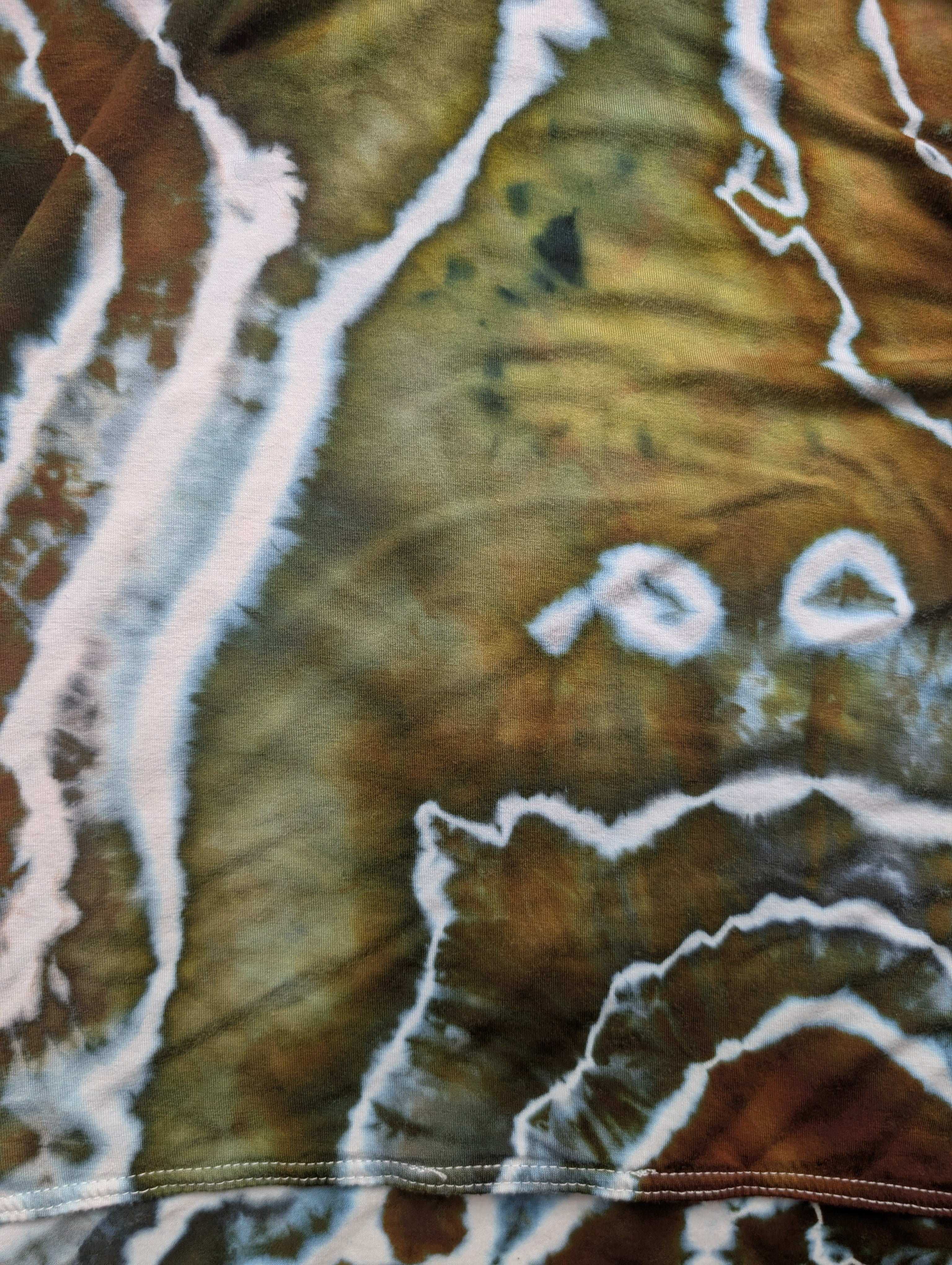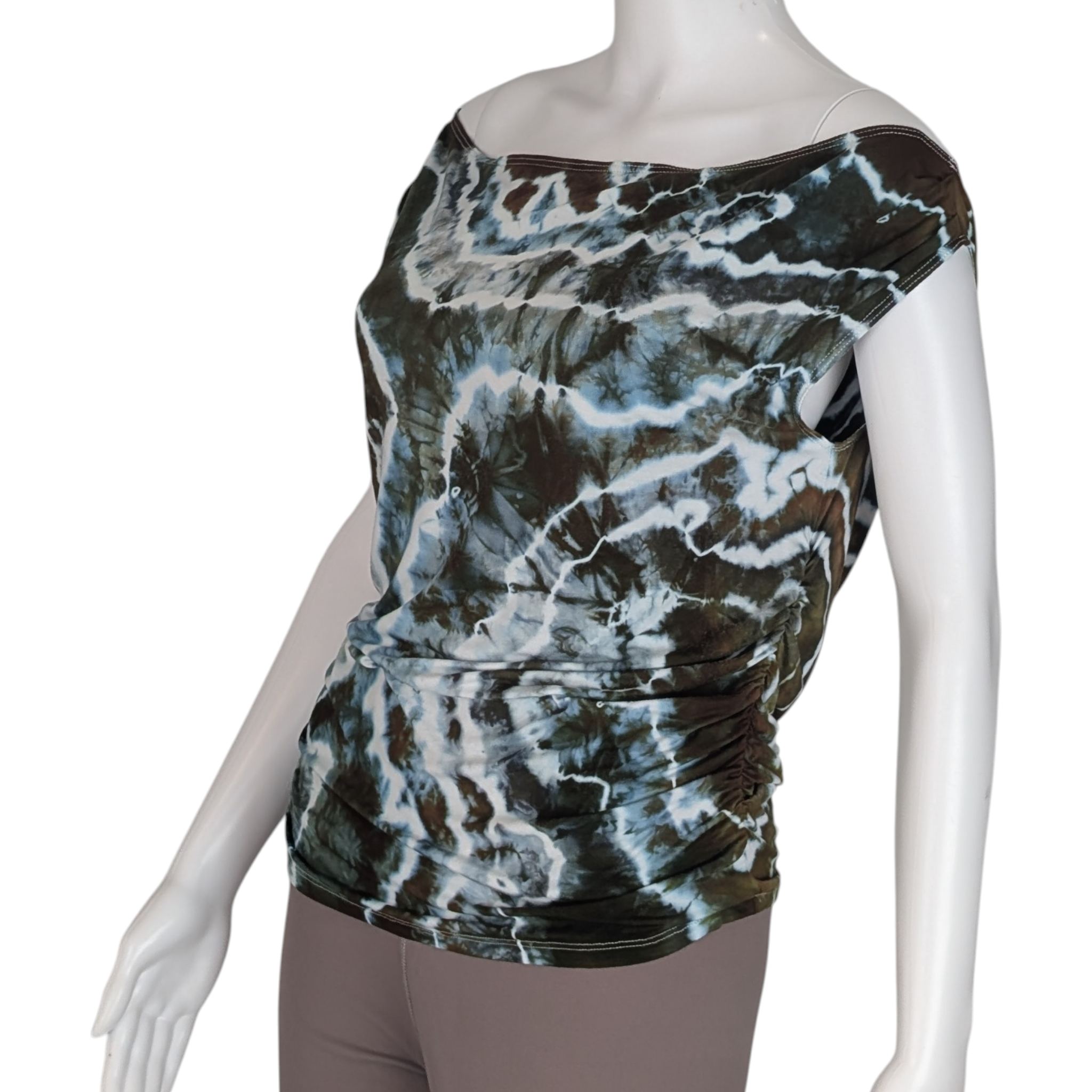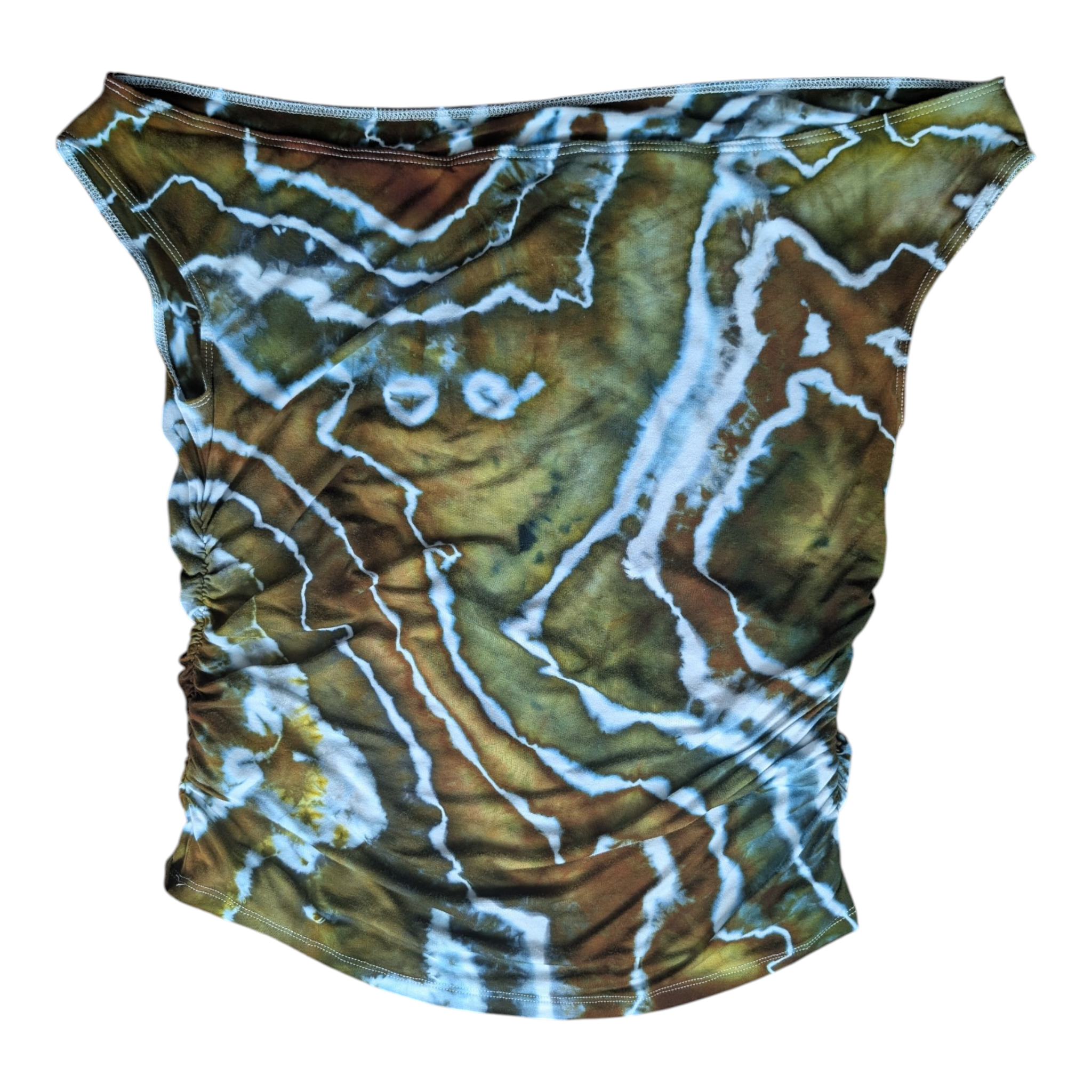 Elevate your everyday look with this stunning off the shoulder top featuring a geode style design in shades of green, blue, bronze, and brown. Made from 95% rayon material, this Elodie top is rouged on each side for a flattering fit.