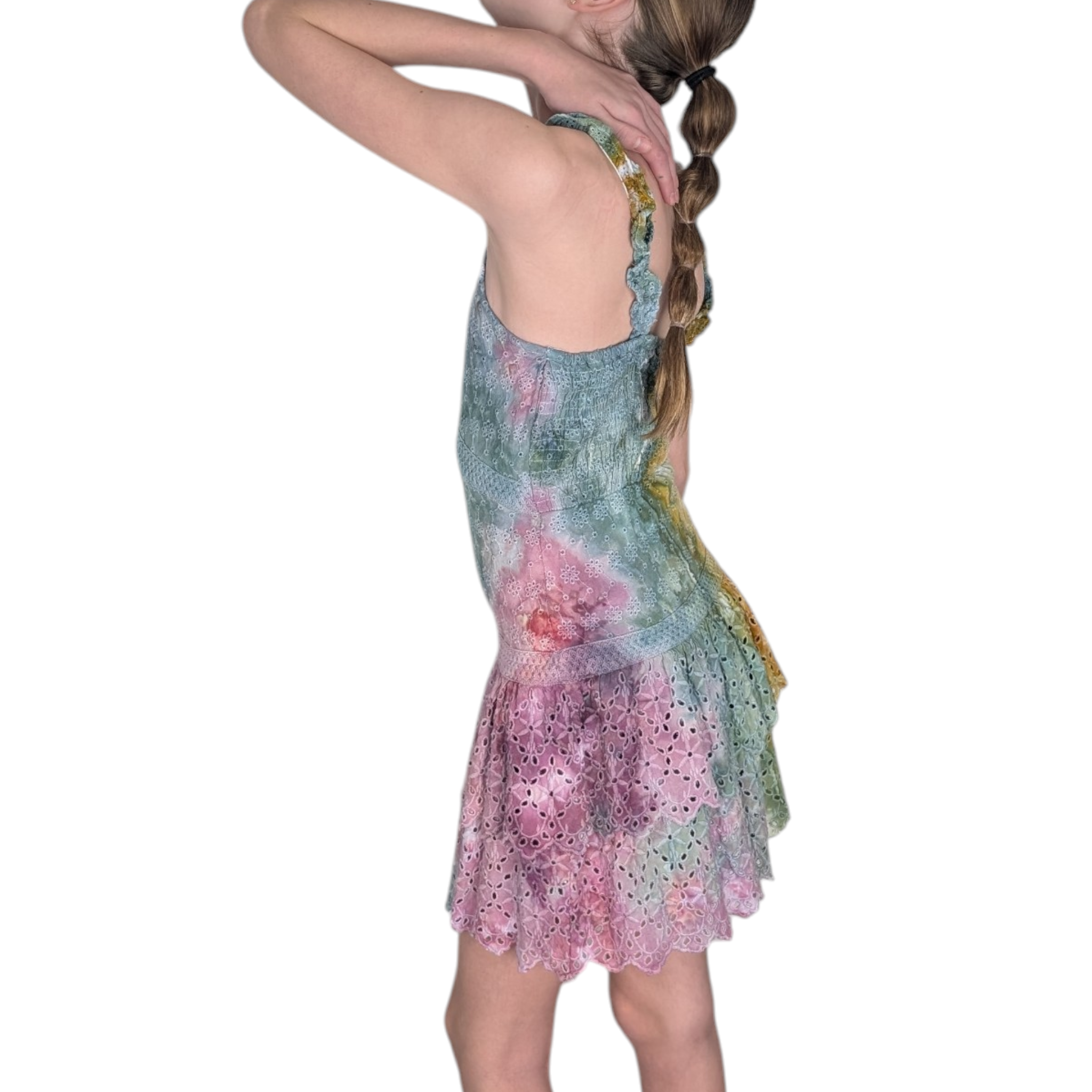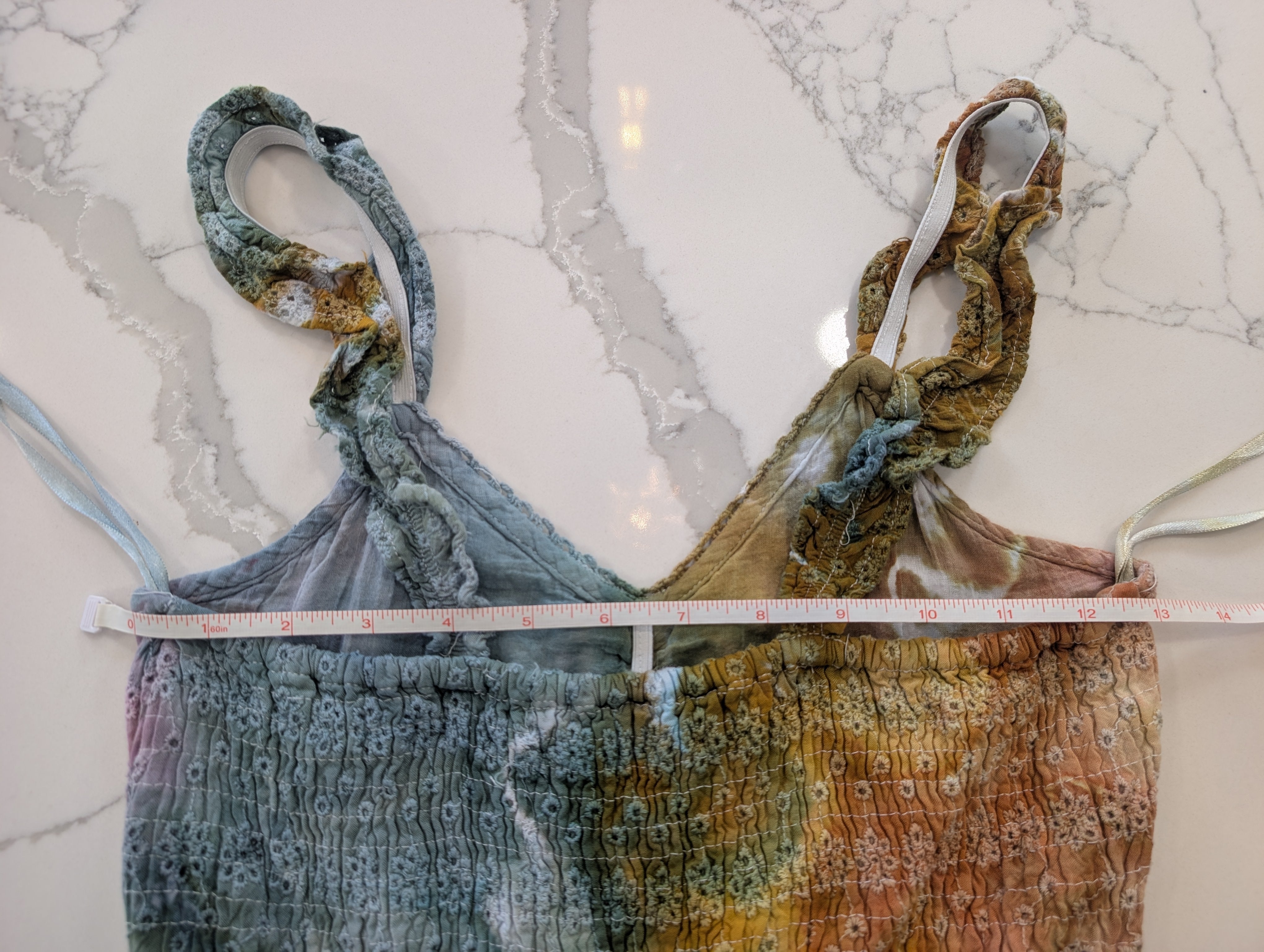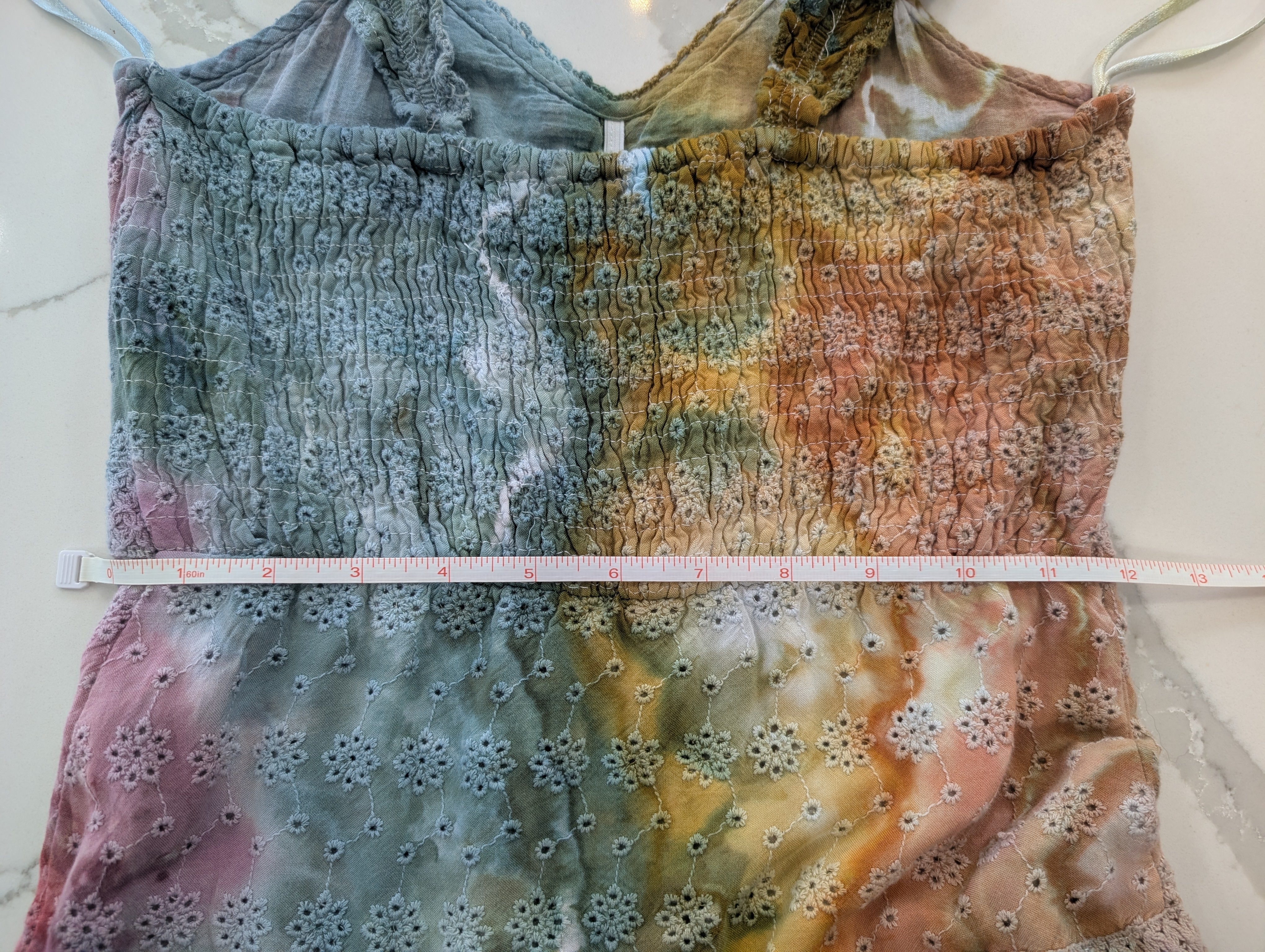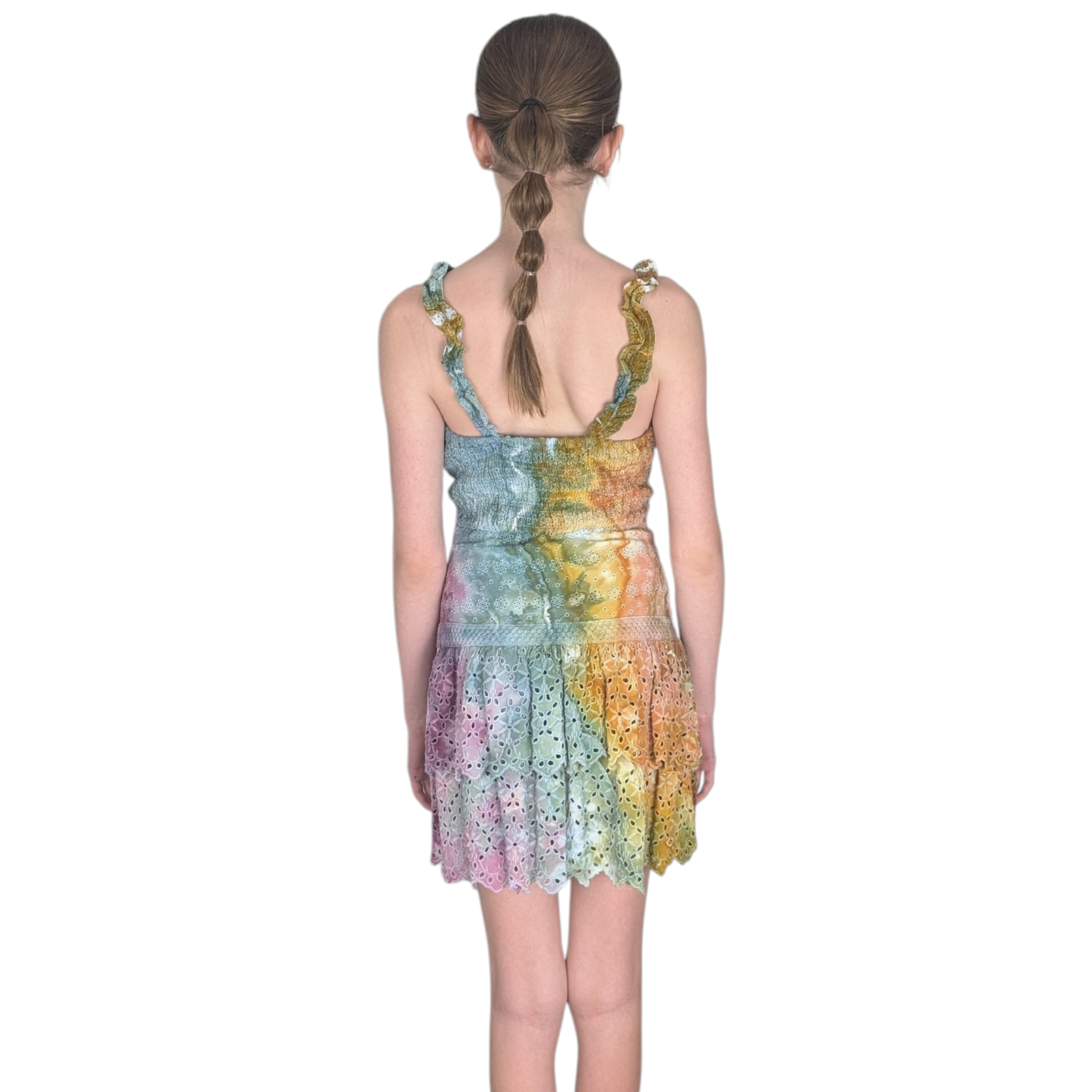 Get ready to turn heads in this stunning geode style tie dye dress! The Autumn rainbow color scheme is perfect for any party or hot day. Made with a 100% rayon shell and 100% cotton lining, this dress features a cute embroidered pattern all over and ruffles straps. Stand out in style with this Sim & Sam brand dress.
