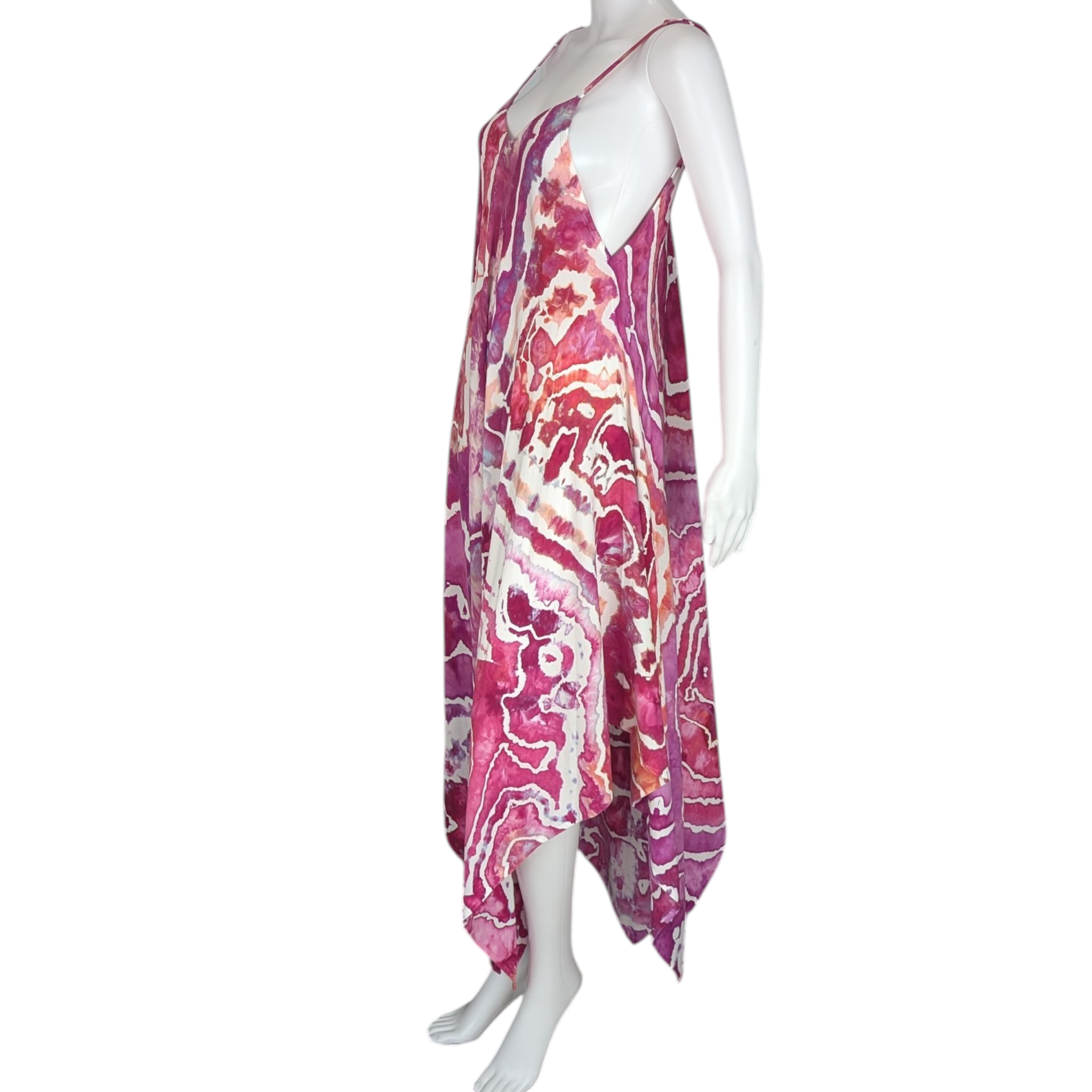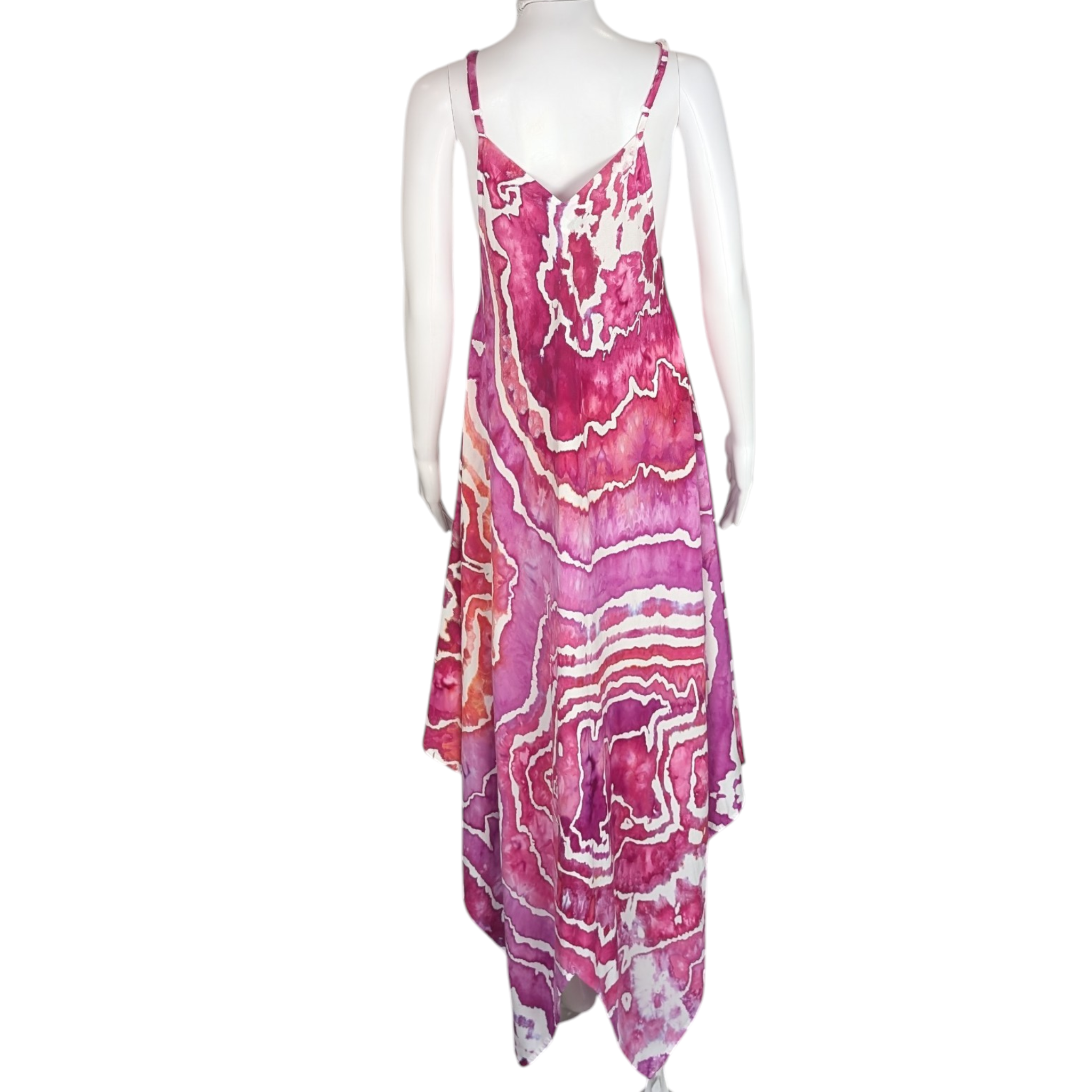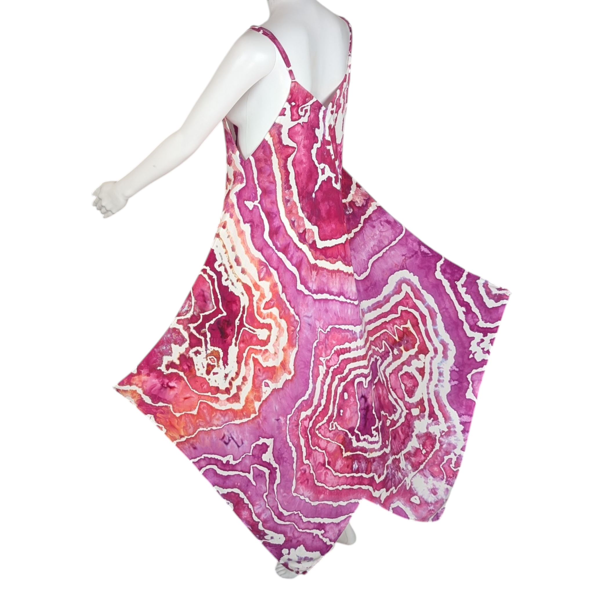 This stunning tie dye maxi dress in geode style design features shades of pink, fuchsia, coral, and pops of purple. With adjustable straps and made of 100% rayon material, it is incredibly soft and comfortable. Perfect for dancing or any special occasion.