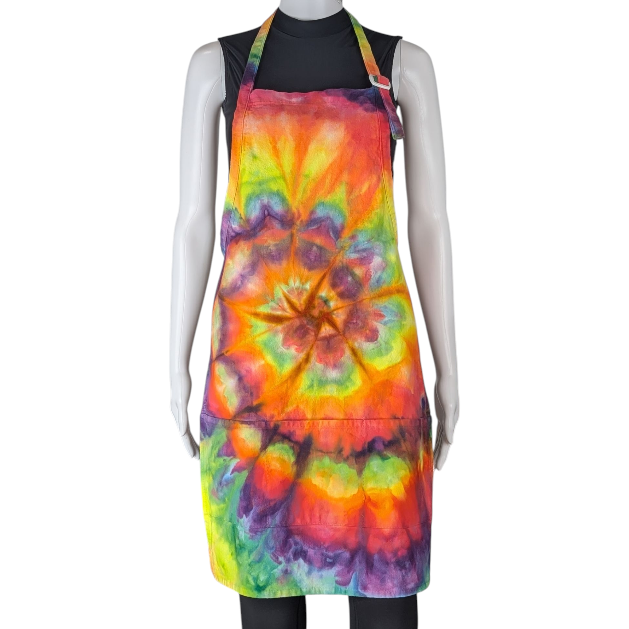 Stand out in the kitchen with this vibrant tie-dye apron featuring a rainbow spiral design. The adjustable neck strap ensures a comfortable fit for everyday wear while cooking or baking. Add a pop of color to your kitchen attire with this one size fits all apron.