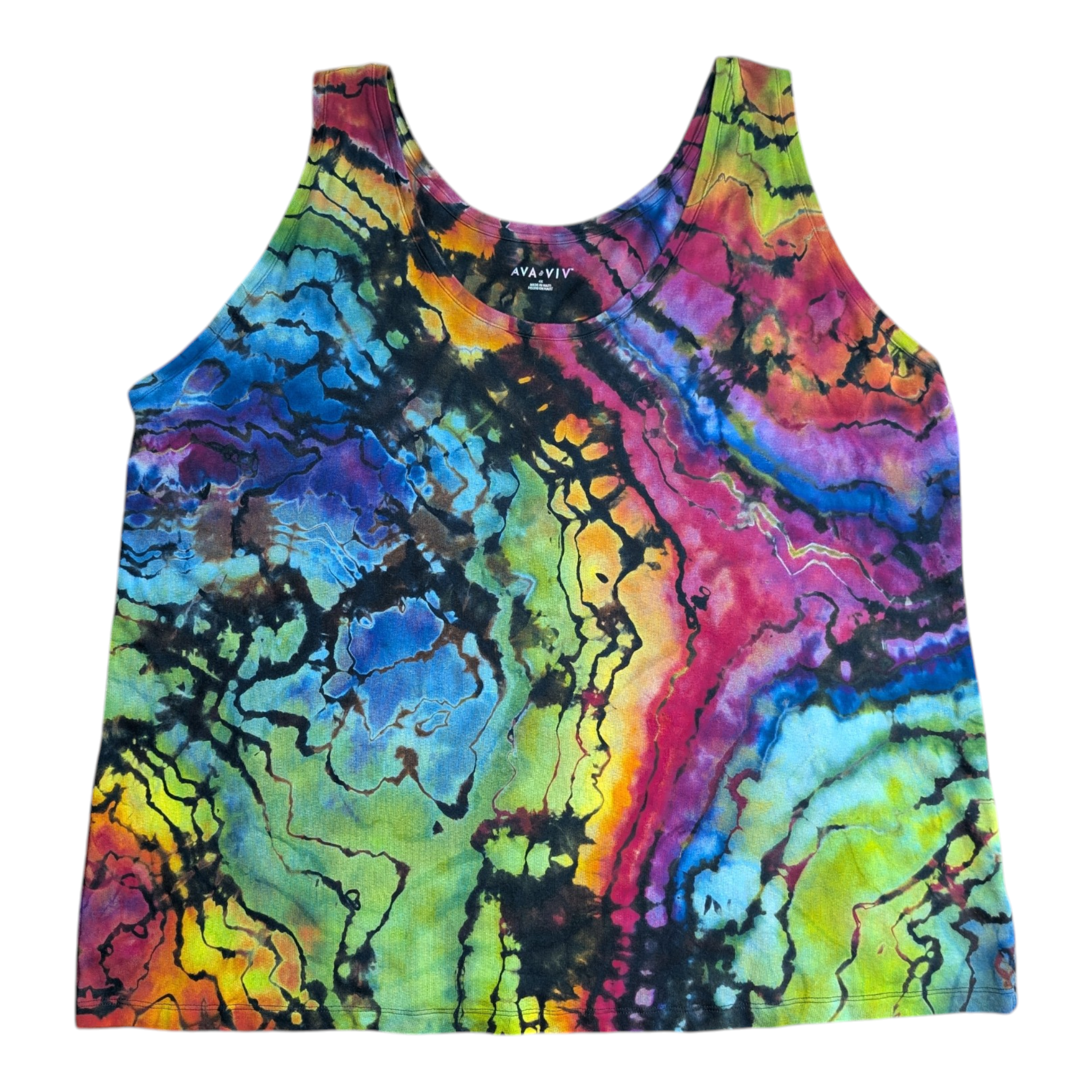 Add a pop of color to your wardrobe with this soft and comfortable tank top featuring a geode style design in shades of black and rainbow colors. Ava and Viv brand, made from a cotton/modal blend. Perfect for making a statement wherever you go.