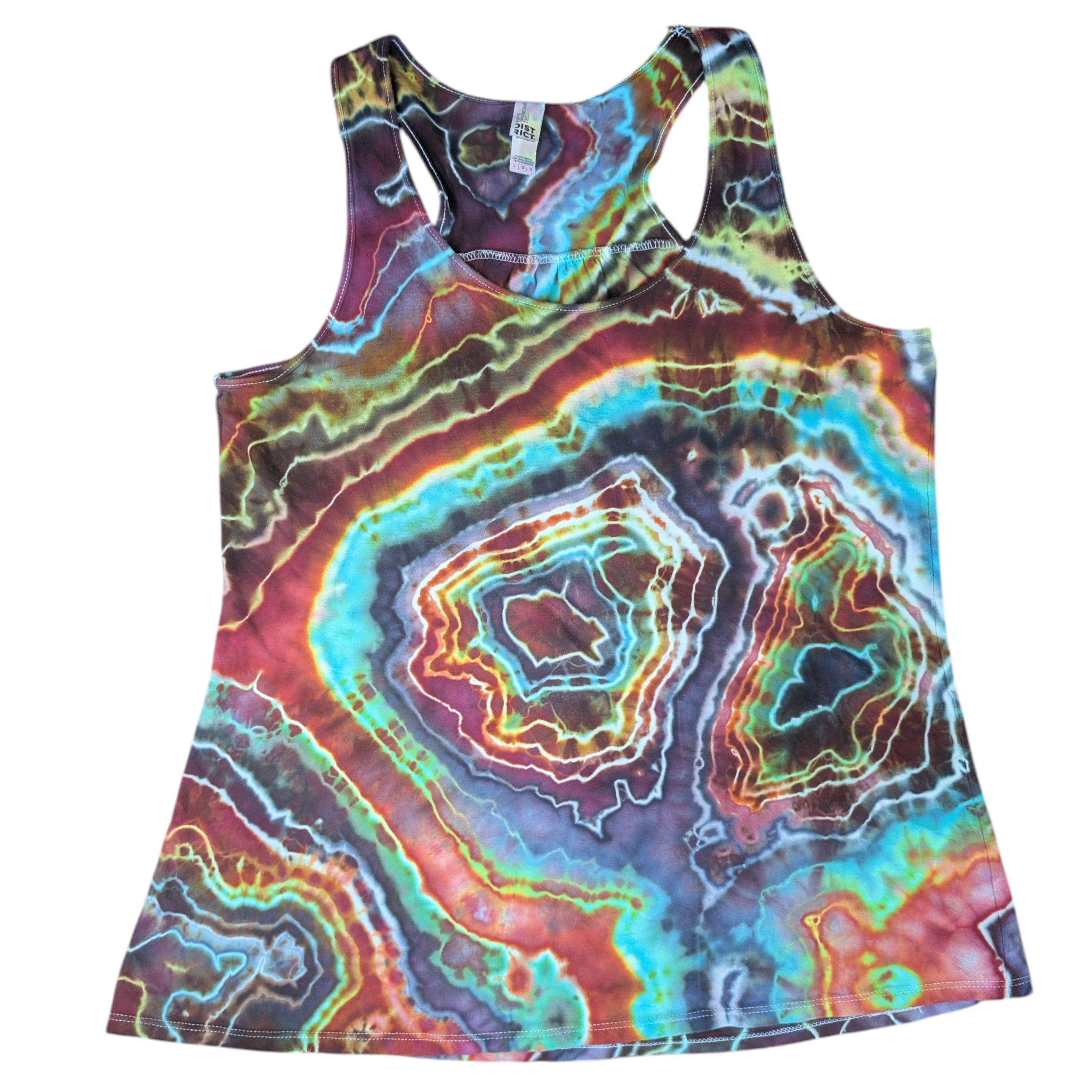 Rock the dark rainbow colors of this 100% cotton flowy racer back tank top with a comfortable fit. Perfect for warm days or adding a pop of tie dye to your workout attire.